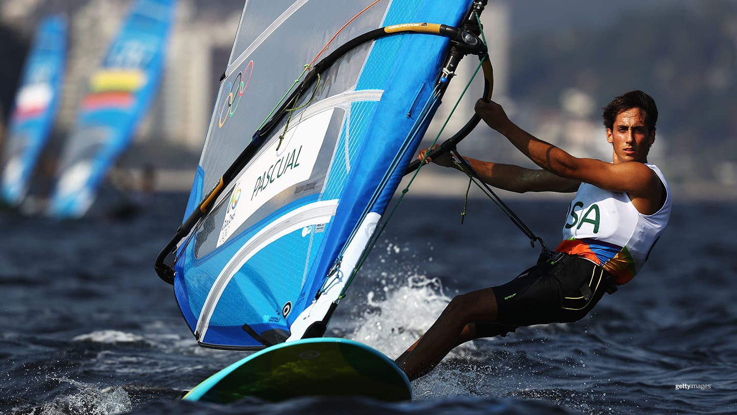 Pedro Pascual competing in the men's RS:X class at the Olympic Games Rio 2016 on Aug. 9, 2016 in Rio de Janeiro.